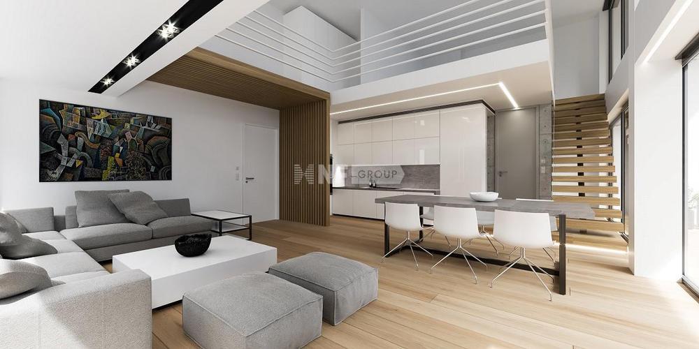Апартаменты находятся на пятом и шестом этажах жилого здания. На первом уровне апартаментов расположена просторная гостиная с обеденной зоной, кухня, 2 спальни и ванная комната. На втором уровне находится основная спальня с ванной комнатой.